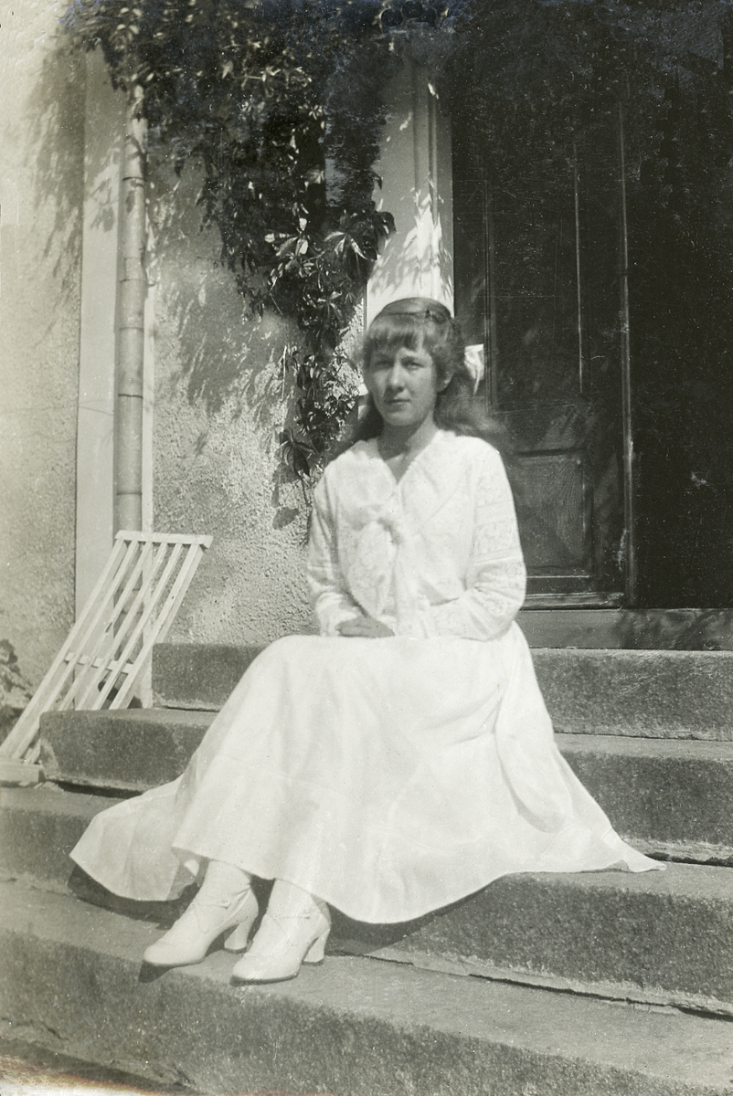 En tonårsflicka i ljus sommarklänning (konfirmation?) sitter på trappan till ett bostadshus.