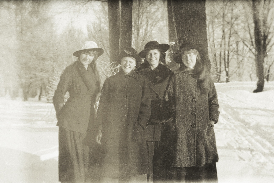 Fyra glada unga damer på vintrig promenad, trol. vid Linnéparken, Växjö.