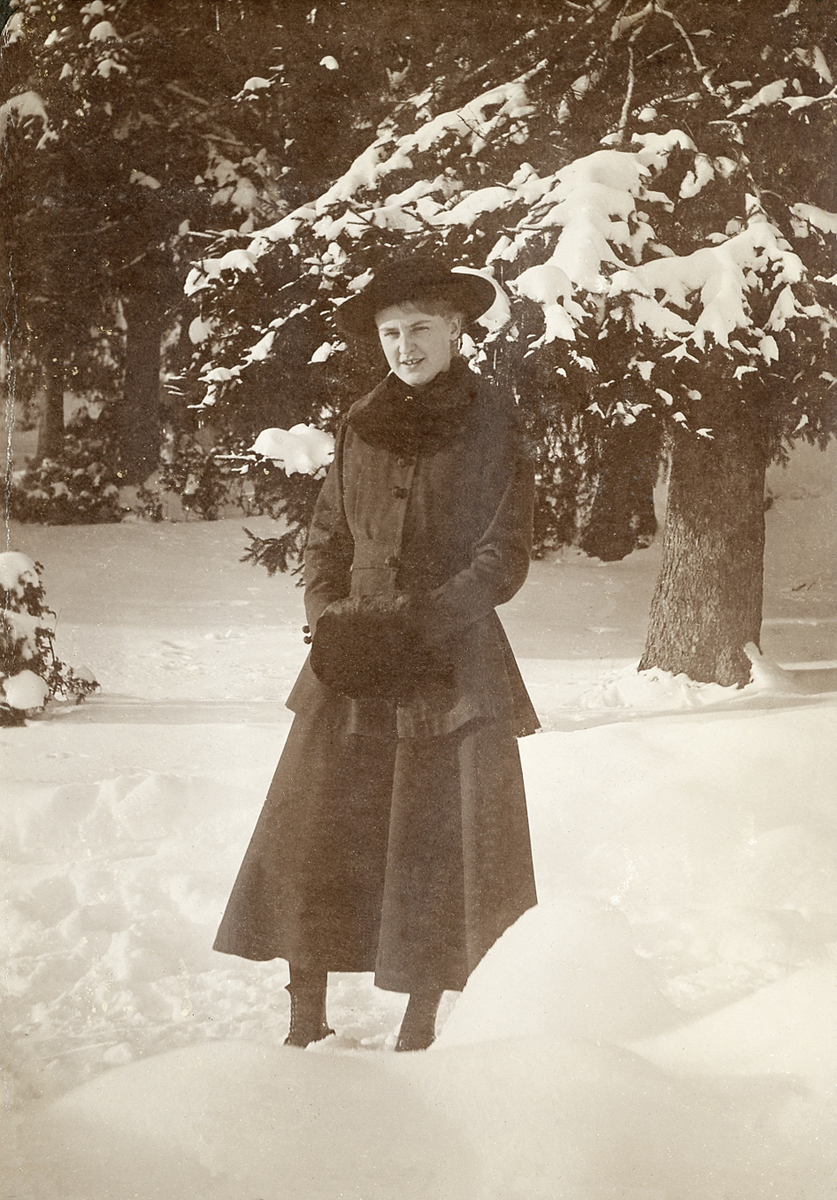 En ung kvinna på vinterpromenad har stannat till för fotografen.