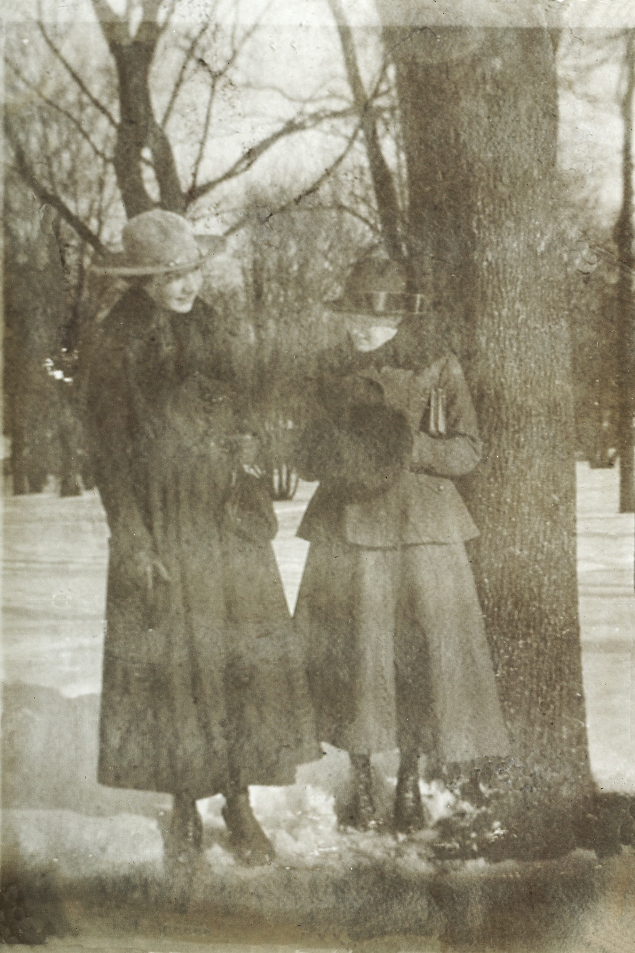 Två unga kvinnor på vinterpromenad, trol. i Linnéparken,