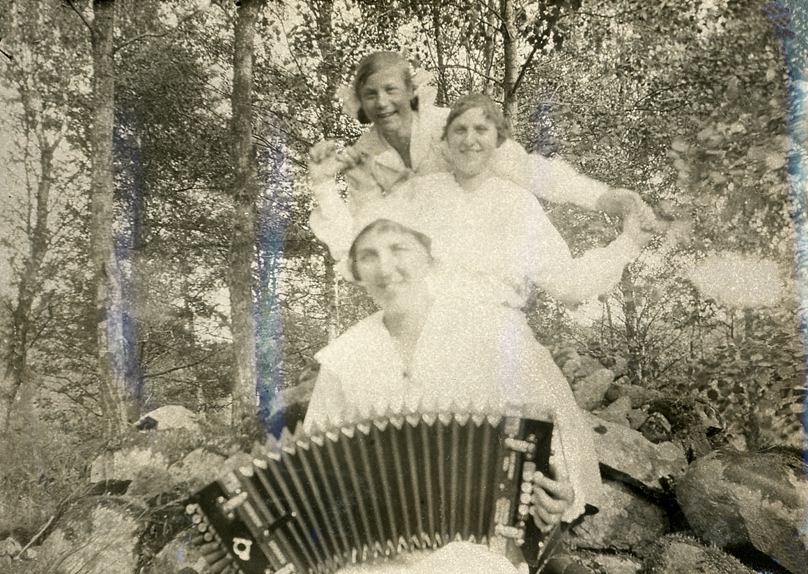 En kvinna spelar dragspel vid ett stenröse, med två yngre kvinnor bakom sig.