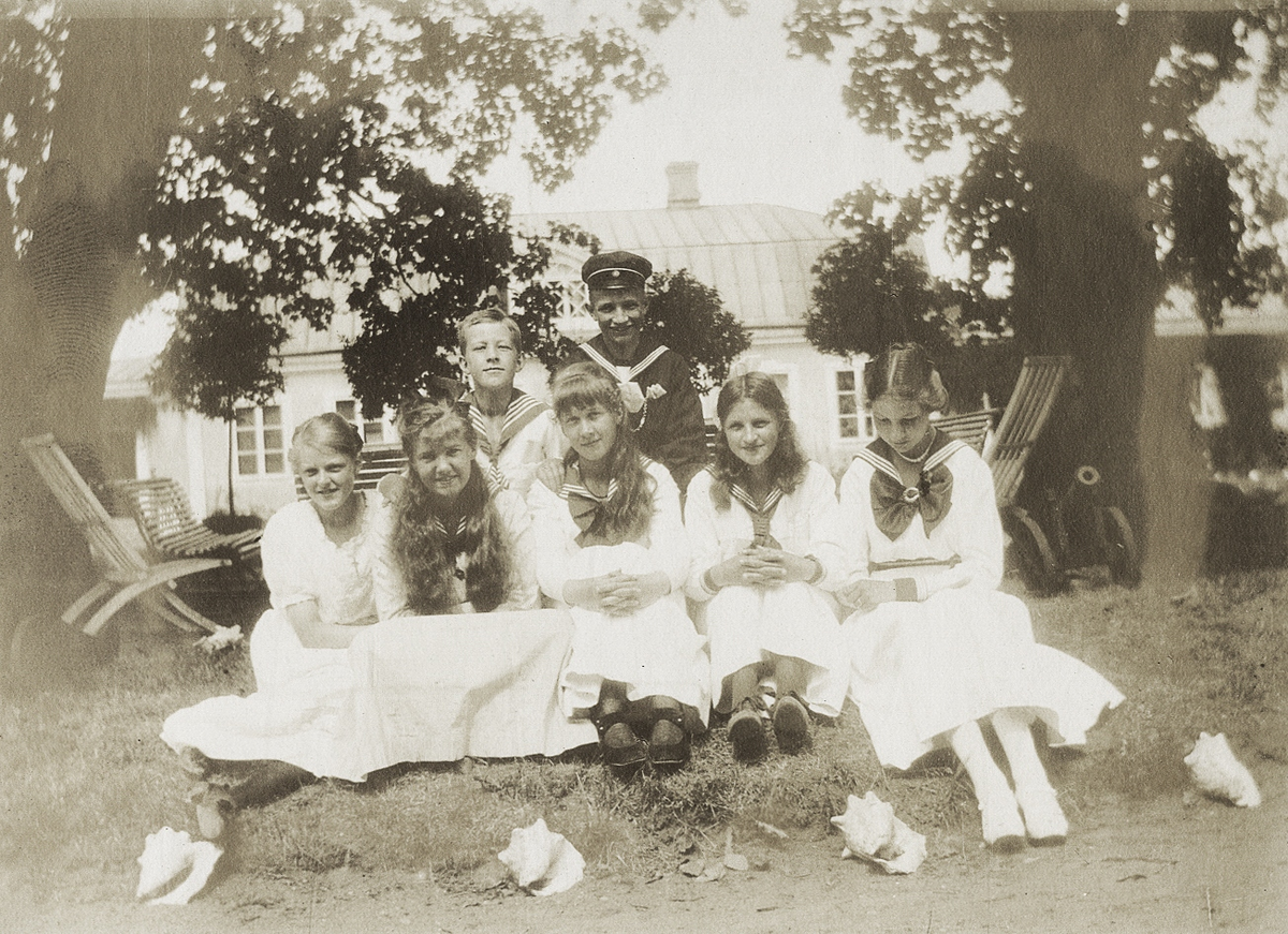 Fyra unga tonårsflickor och två pojkar har samlats för fotografen i en park. I bakgrunden syns ett större bostadshus, trol. Gårdsby säteri.