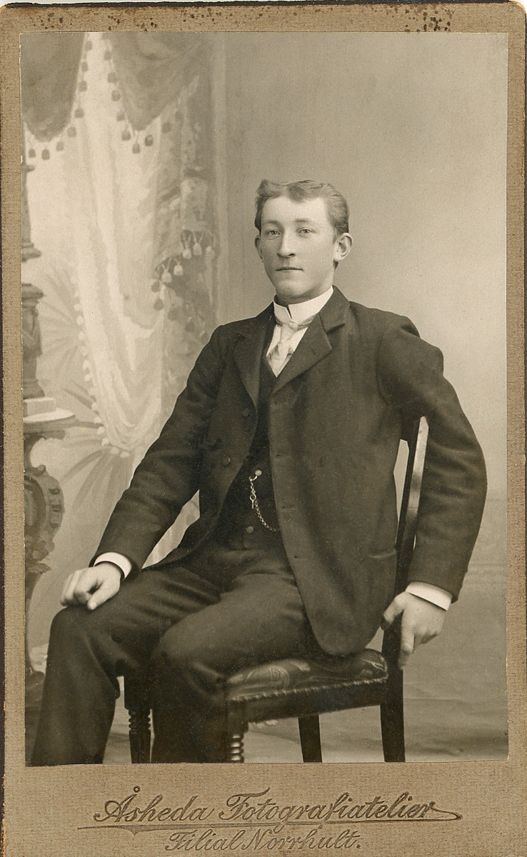 En okänd ung man, klädd i kavajkostym med väst och klockkedja, ljus slips och stärkkrage.