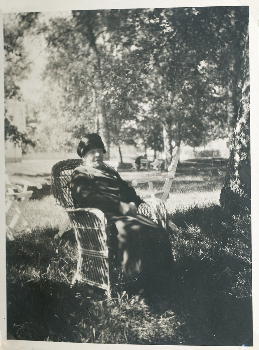 Fröken Sally Eksandh har slagit sig ner i en korgstol i Strandbjörket.