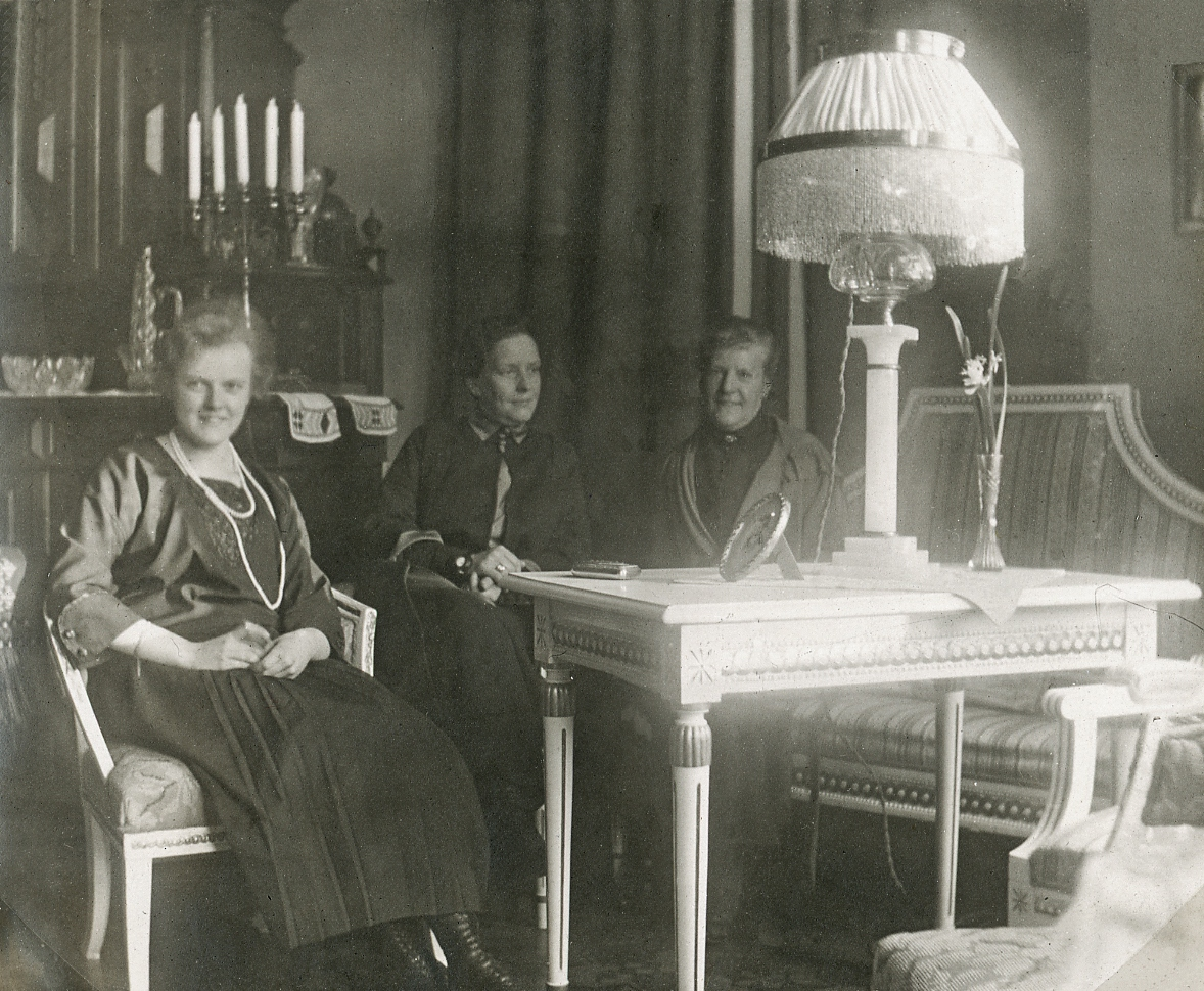 Tre kvinnor sitter i en soffgrupp i vitt och guld i en salong. Fr.v.: Margareta Bergstedt (g. Lidén), fru Elsa Laudien och fru Elisabeth Bergstedt.