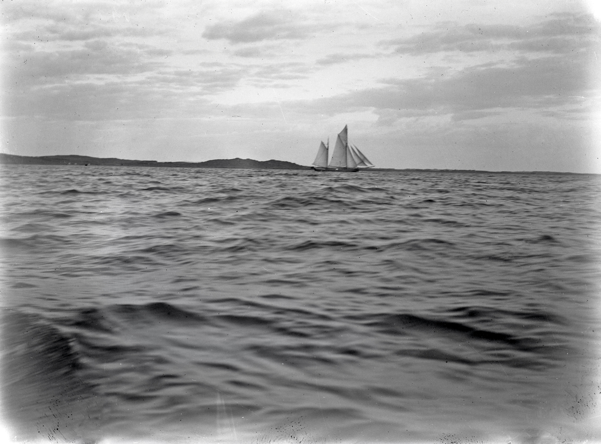 Ett segelfartyg (s.k. ketch ?) till havs.
