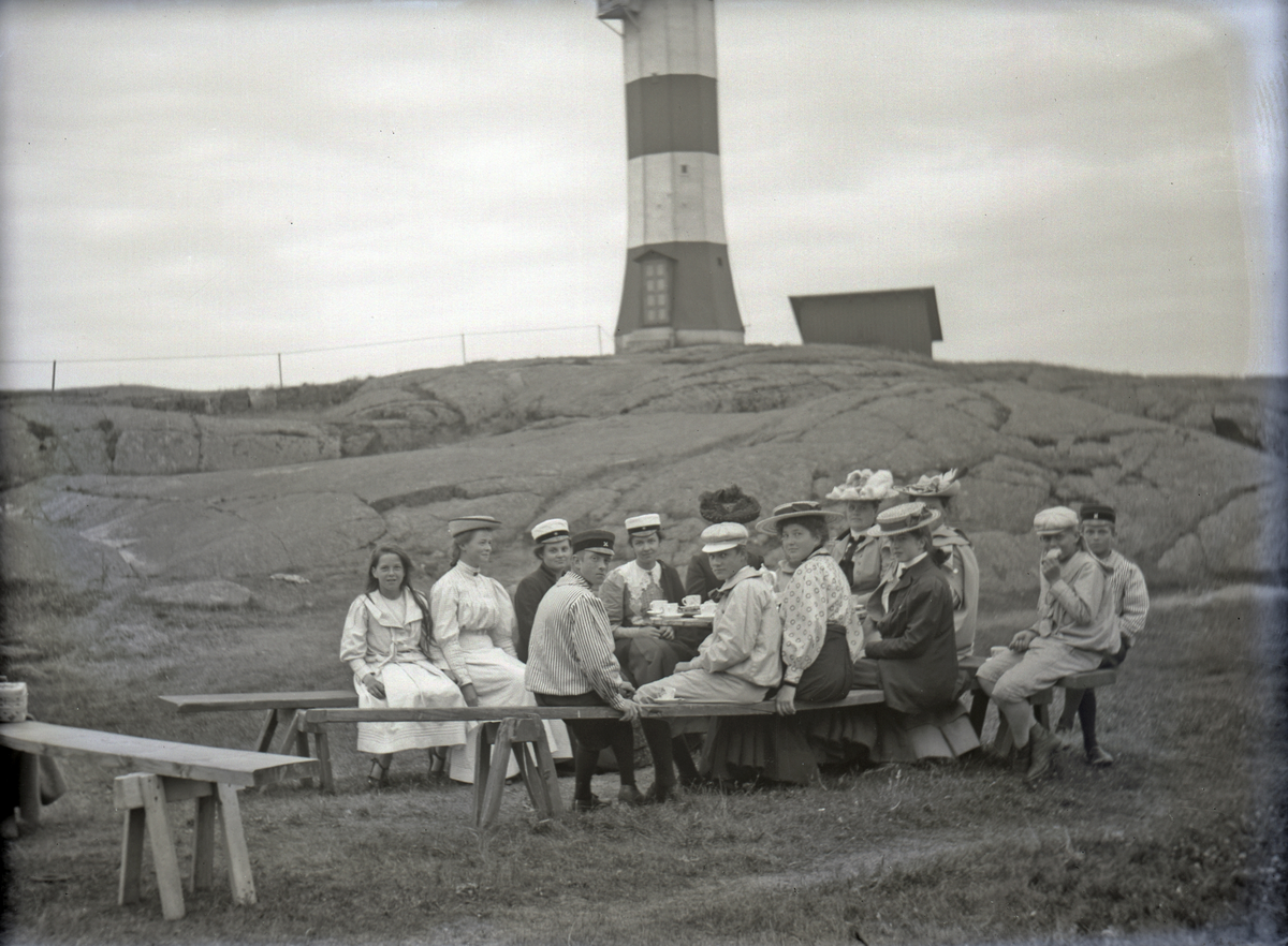 Ett sällskap (däribland några kvinnliga studenter), som sitter och dricker kaffe m.m., nedanför en fyr.