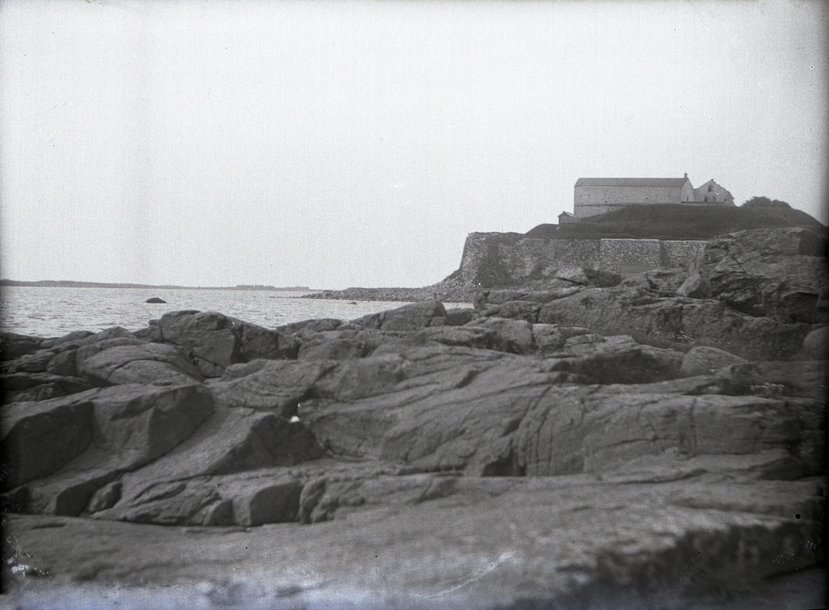 Vy över Varbergs fästning från ett klippigt strandparti.