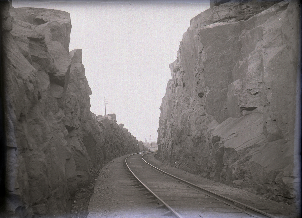 En järnväg som löper fram mellan höga klippväggar. I bakgrunden skymtar några telefonstolpar och ett kyrktorn.