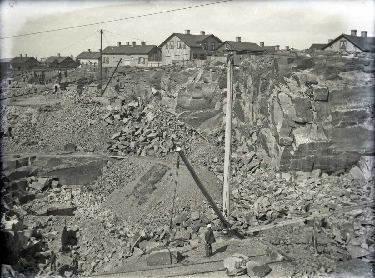 Ett stort stenbrott. I förgrunden syns två män och en lyftkran. I bakgrunden ser man några bostadshus m.m.