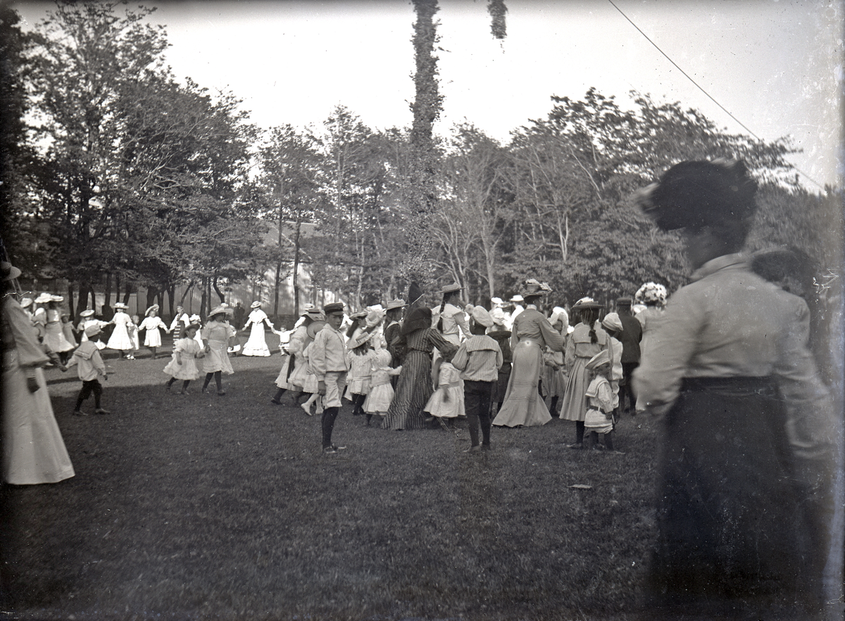 En mängd mammor, barnflickor och barn dansar runt midsommarstången, trol. i Societetsparken, Varberg.
