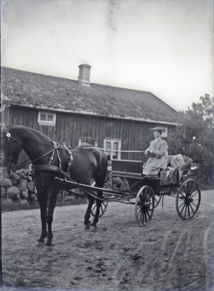 En kvinna sitter med tömmarna i hand i en vagn utanför ett gammalt bostadshus på landet. Trol. utanför Varberg.