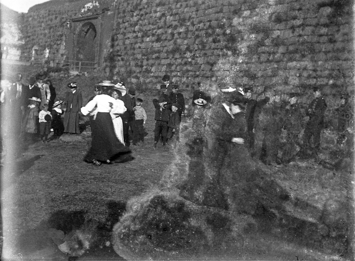 Man ser några dansande och en hel del åskådare, bl a några beväringar.