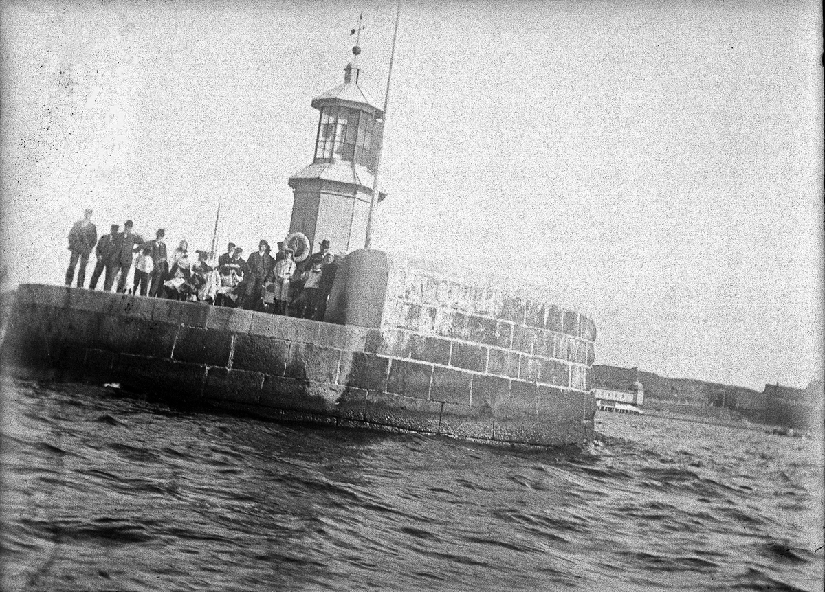 Yttersta spetsen på hamnpiren i Varberg, med fyr och människor.