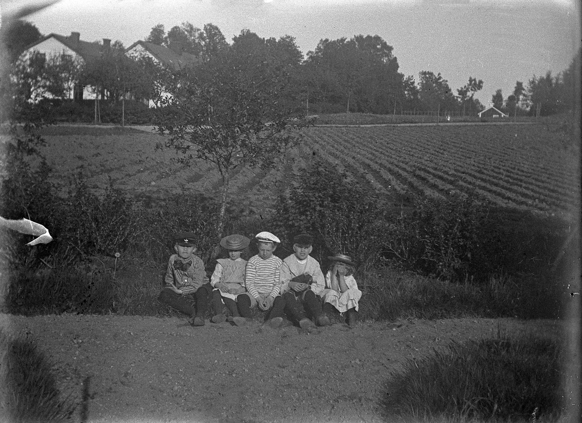 Foto av fem barn som slagit sig ner på en smal gräsmatta, utmed en grusgång.