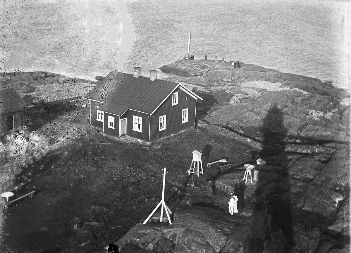 Ett bostadshus (fyrvaktarbostad ?), med fyren som en stor skugga bredvid. Man ser också en del meterologiska mätinstrument, några människor och en segelbåt som ligger förtöjd i bakgrunden.