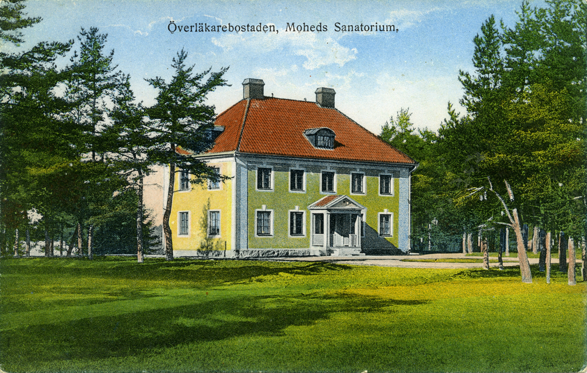 Ett brevkort med motiv av överläkarebostaden, Moheds Sanatorium. Konstförlaget FRAM, Stockholm.