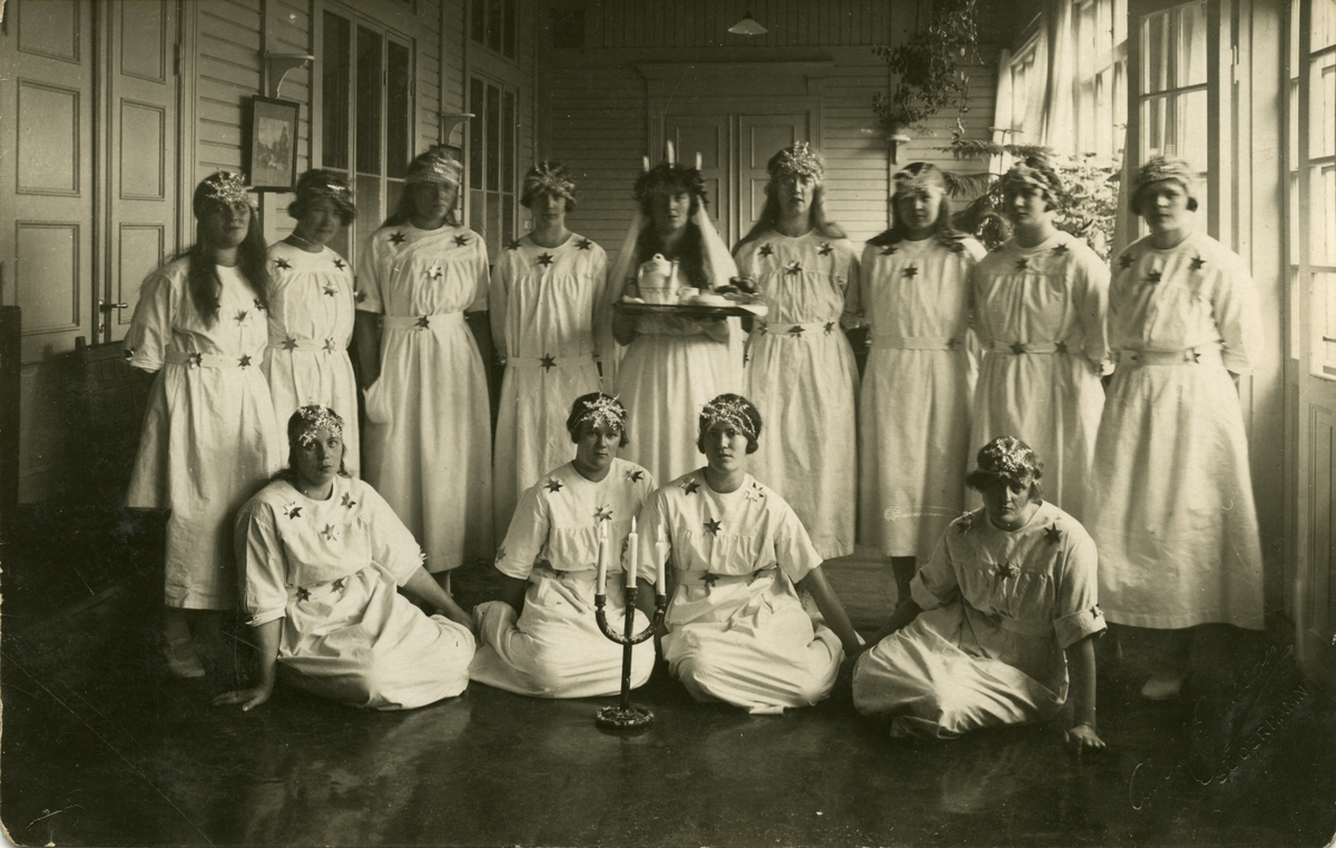 En grupp kvinnor som firar Lucia vid Moheds sanatorium.