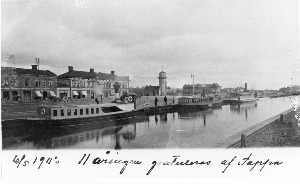Vykort från Söderhamn. Skärgårdsbåtarnas tilläggsplats i Söderhamnsån framför kvarter Alen och Köpmantorget. Foto omkring år 1900.