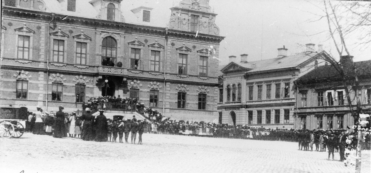 Skolavslutning på Rådhustorget i Söderhamn våren 1902.