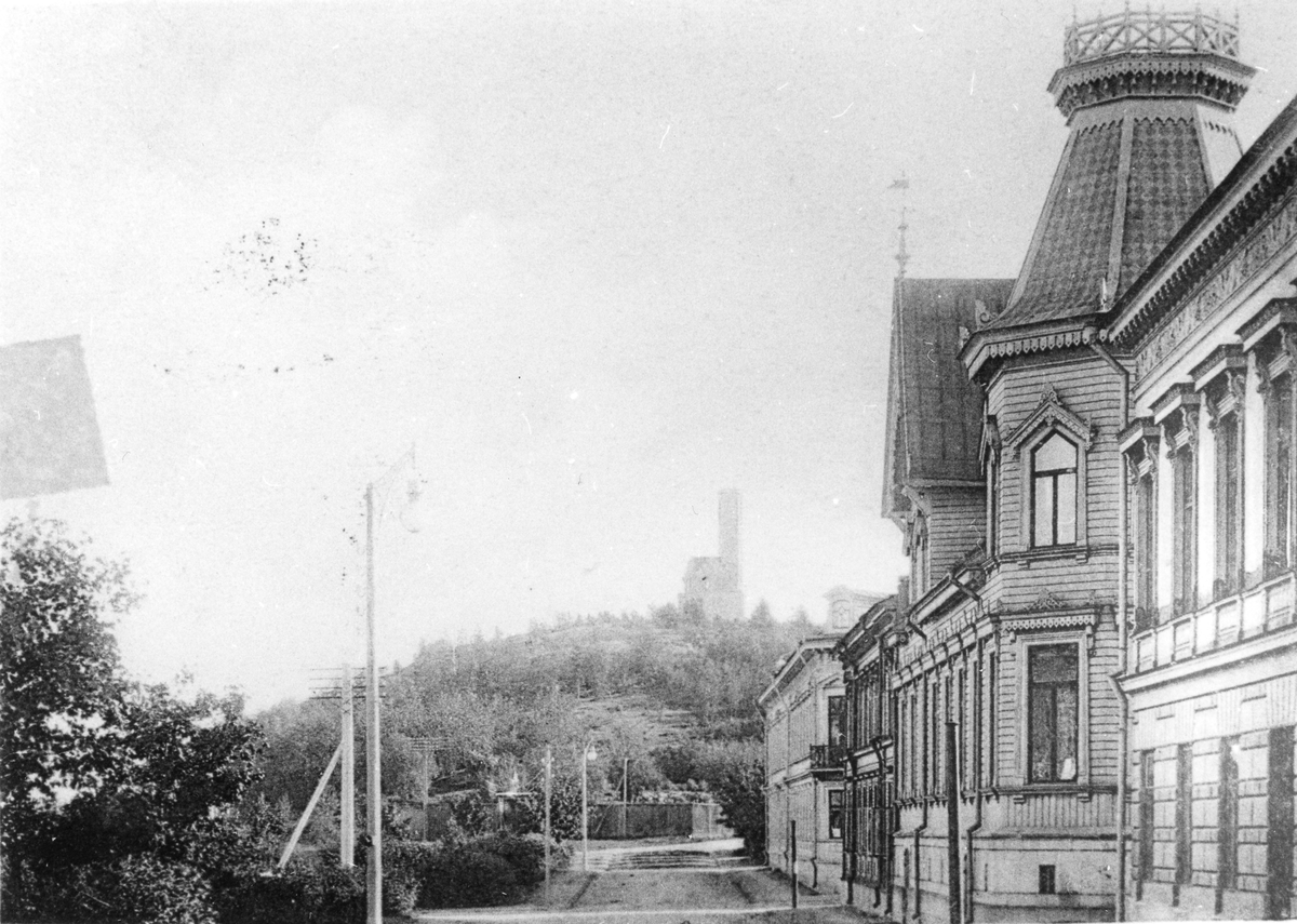 Vykort från Söderhamn. Västra Storgatan med Östra Berget i fonden. Foto omkring år 1900.
