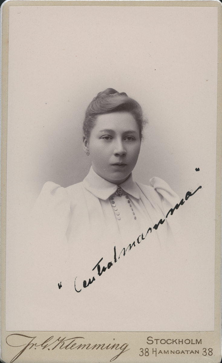 Kvinnoporträtt. Text på framsida kort: "Central mamma".