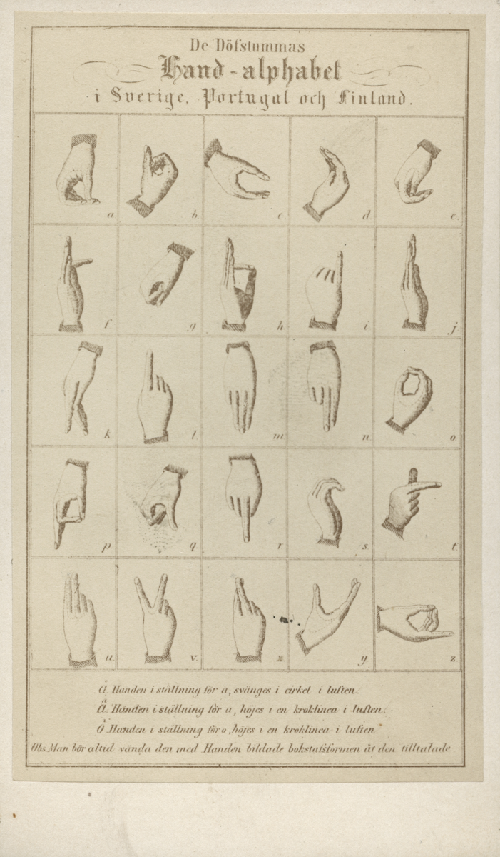 Kort med handalfabetet för dövstumma i Sverige, Portugal och Finland.
