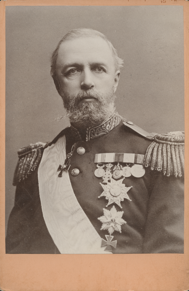 Kungaporträtt av Oscar II, kung av Sverige från 1872-1907 och kung av Norge från 1872-1905. Text på baksida kort: "Af Gerda på Tekladagen 1887".
