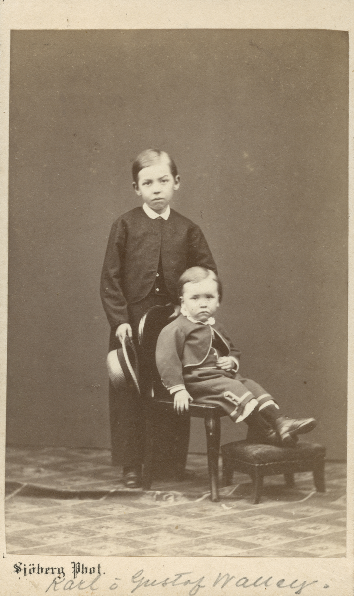Porträtt av Karl (stående) och Gustaf (sittande) Valley (enligt text baksida kort).