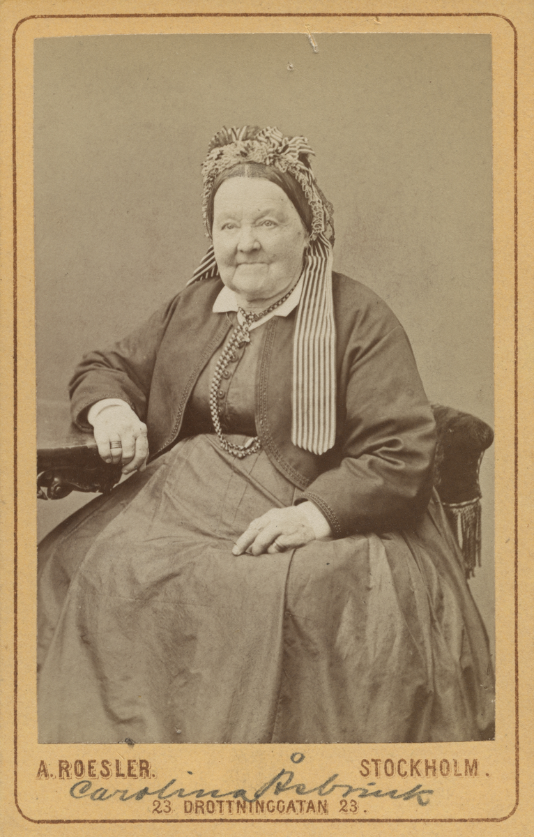 Porträtt av Carolina Åsbrink. Text baksida kort: "aftaget vid 77 års ålder".