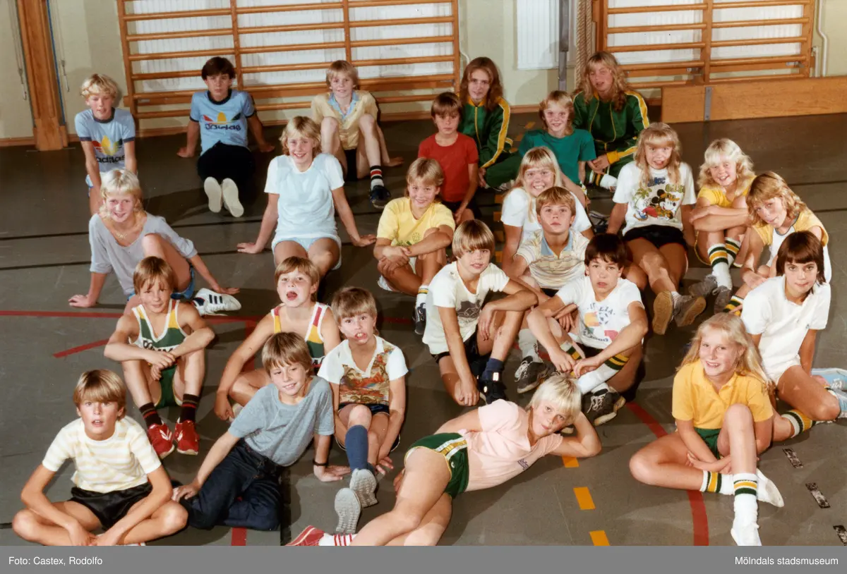 Porträtt av unga basketspelare i Kvarnby Basket. Fotografi taget i en gymnastiksal i Mölndal, år 1983.