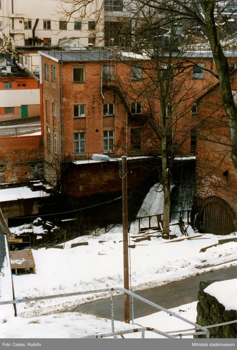 Industribebyggelse vid Götaforsliden i Mölndals Kvarnby, vintern 1988.