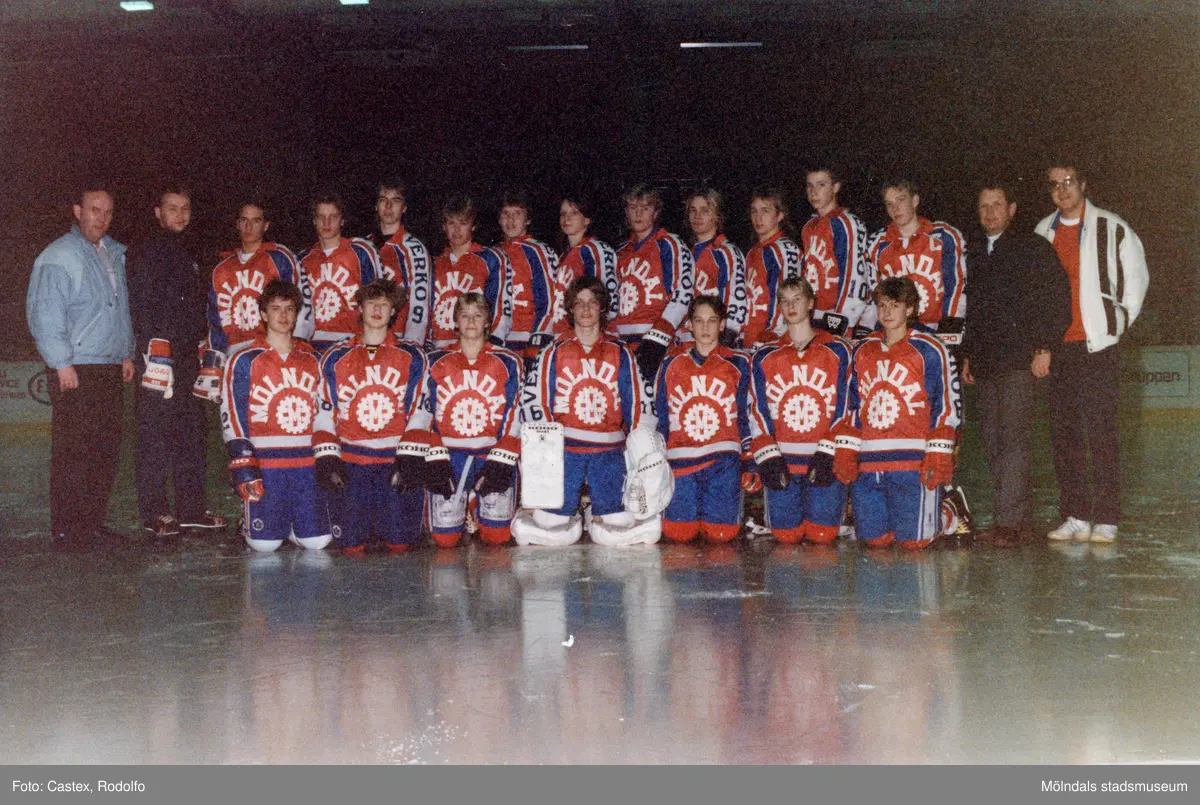 Lagbild av IF Mölndal Hockey, pojkar födda 1969. Fotografi taget i januari 1986.