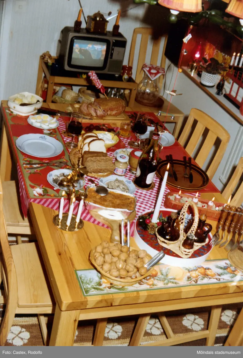 Julbord för två. Ett dukat bord på Höjdgatan i Mölndal, år 1980.