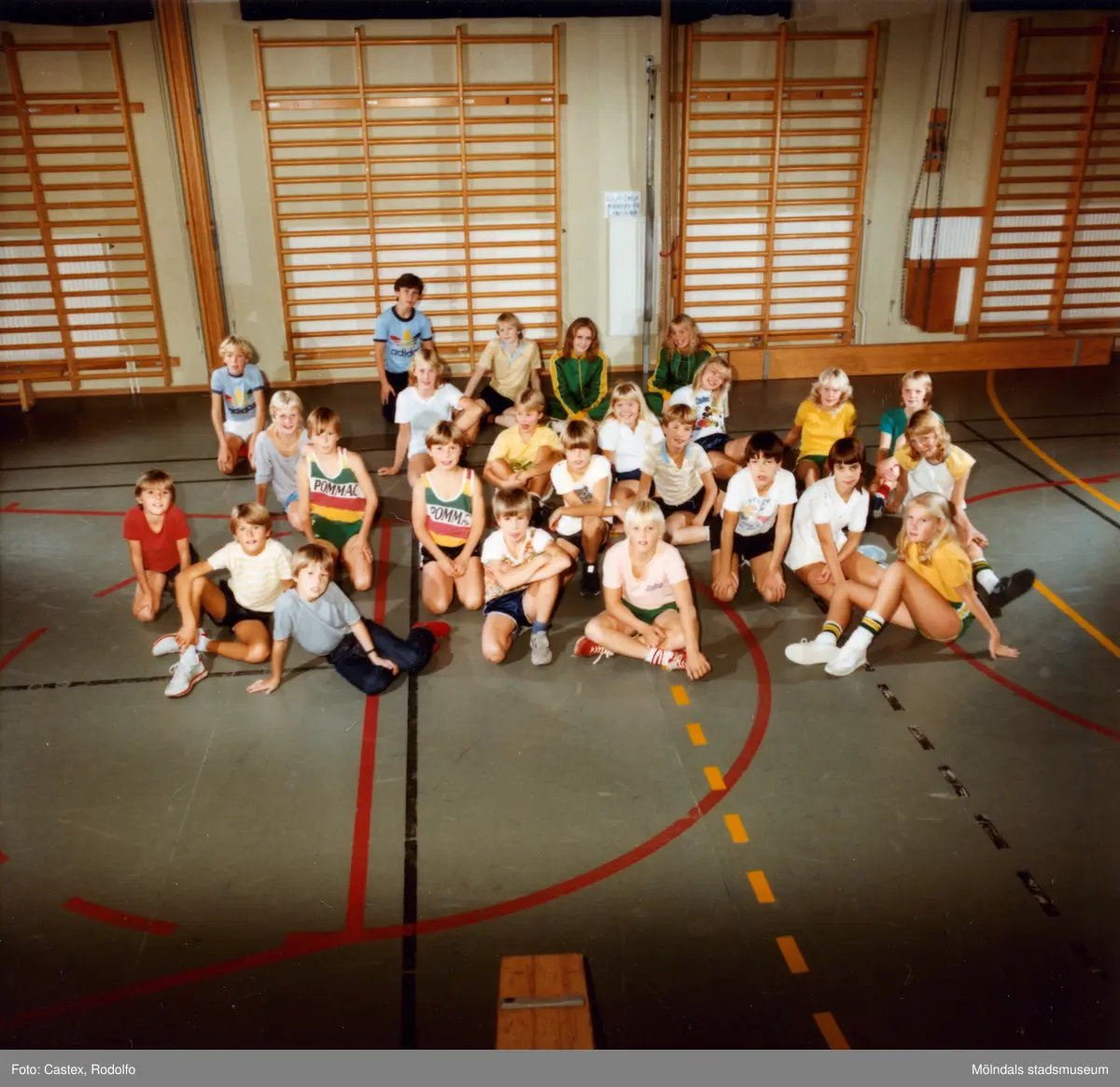 Porträtt av unga basketspelare i Kvarnby Basket. Fotografi taget i en gymnastiksal i Mölndal, år 1983.