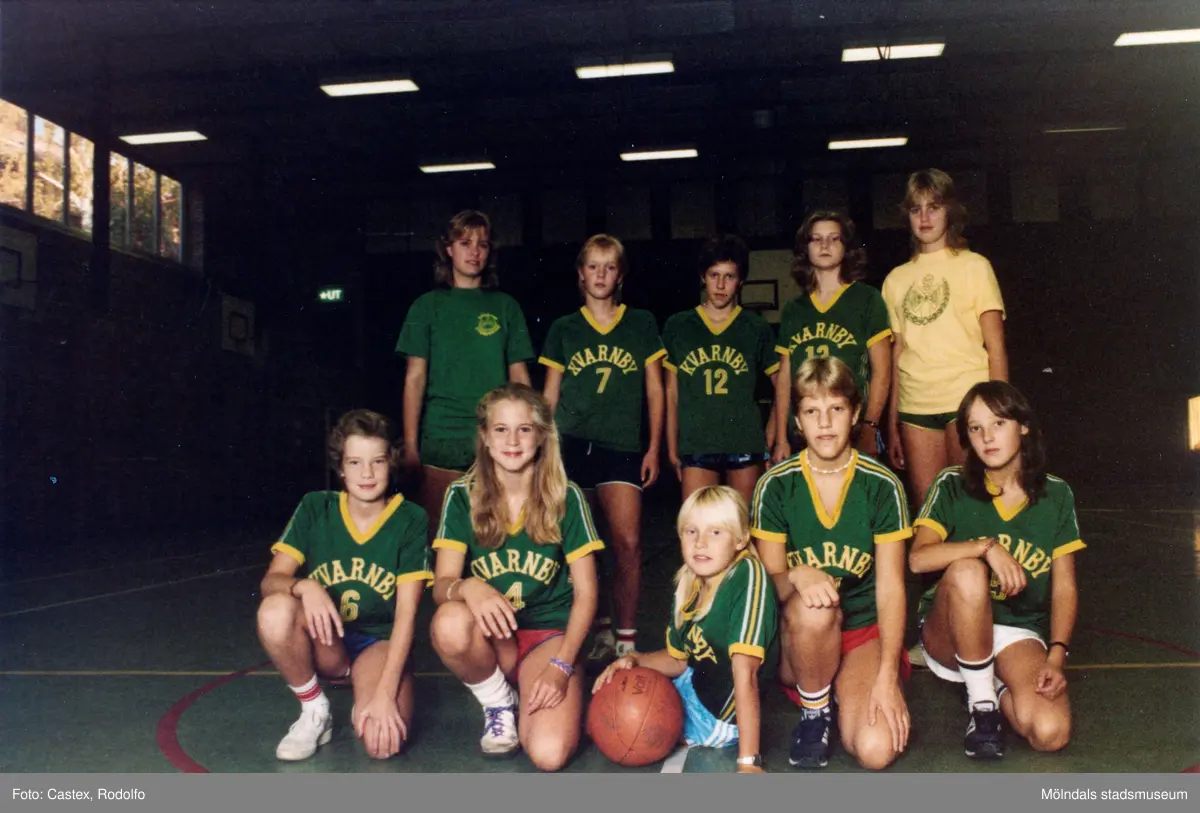 Lagbild på ungdomar i Kvarnby Basket. Fotografi taget i en idrottshall i Mölndal, år 1983.