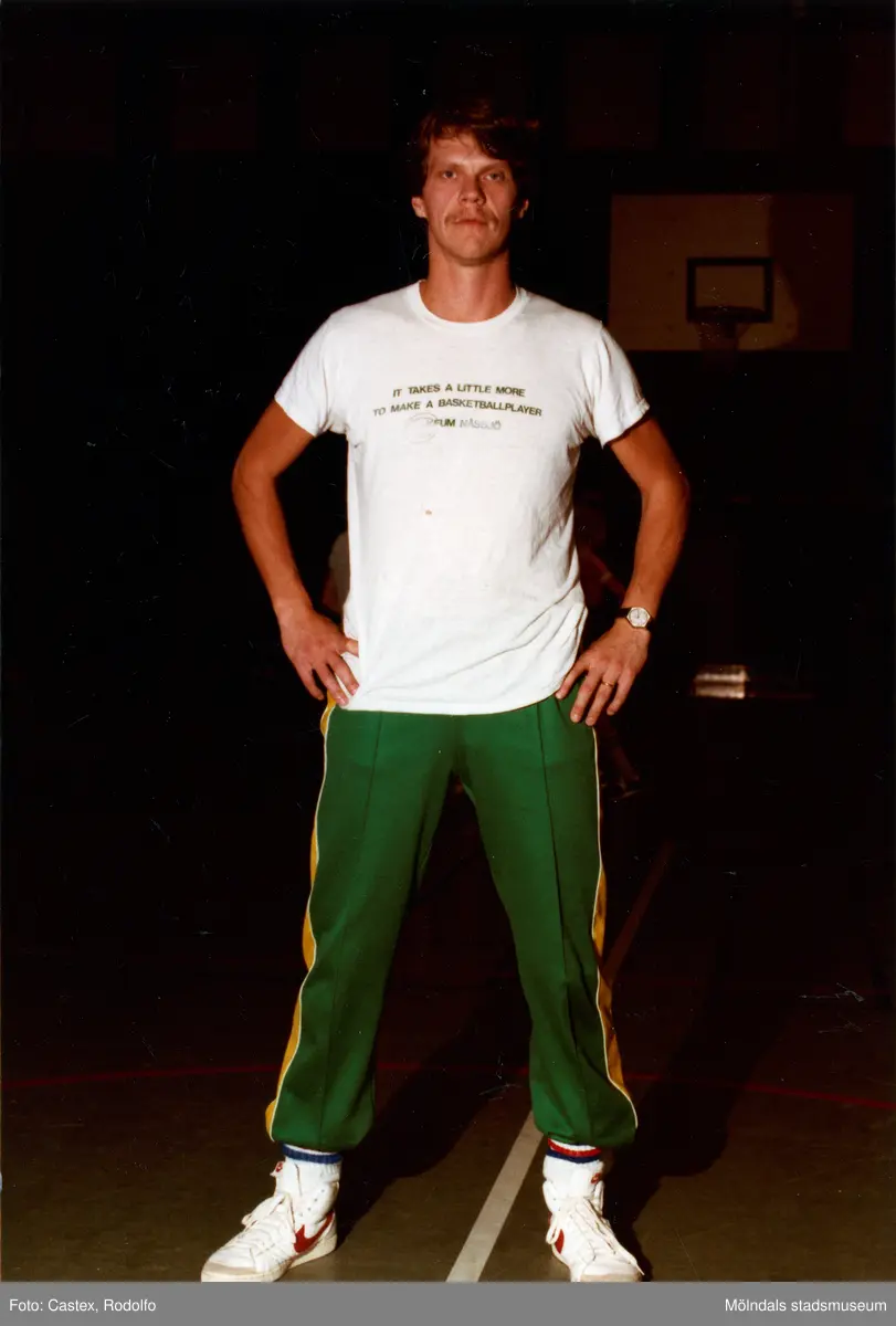 Porträtt av ledare i Kvarnby Basket. Fotografi taget i en idrottshall i Mölndal, år 1983.