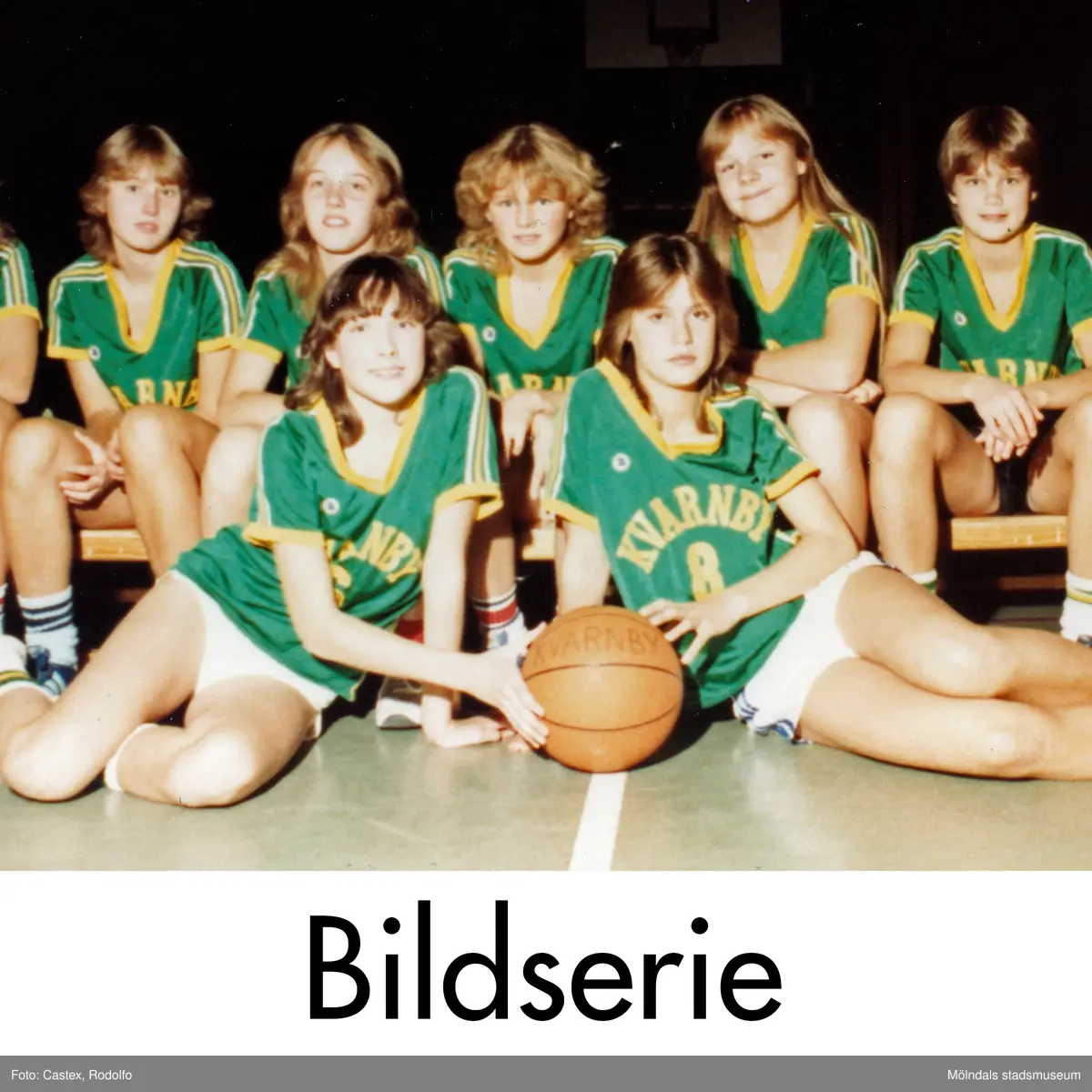 Serie om sex fotografier som visar lagbilder av Kvarnby Basket tagna i en idrottshall i Mölndal, år 1983.