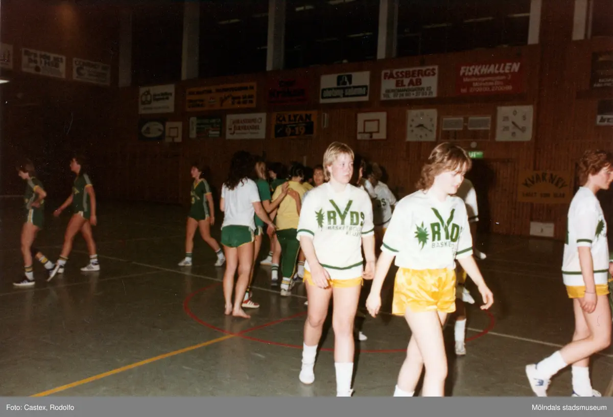 Idrottshuset i Mölndal, mars 1984. Kvarnby Basket spelar match mot Ryds Basketklubb. Slutresultat är okänt.