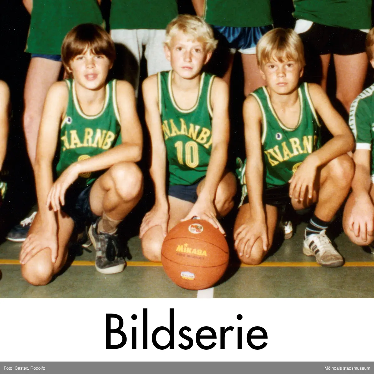 Serie om sex fotografier som visar lagbilder av Kvarnby Basket samt porträtt av ledare i samma förening. Fotografier tagna i en idrottshall i Mölndal, år 1983.