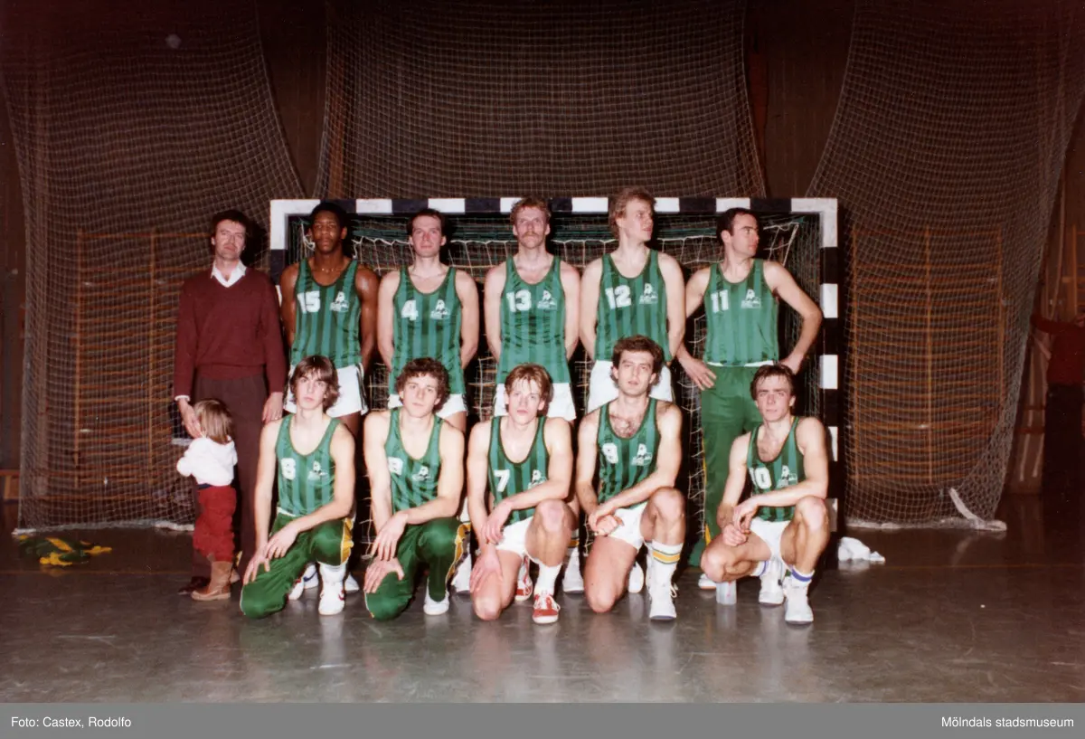 Lagbild av Kvarnby Baskets A-lag herrar. Idrotthuset i Mölndal, mars 1984.