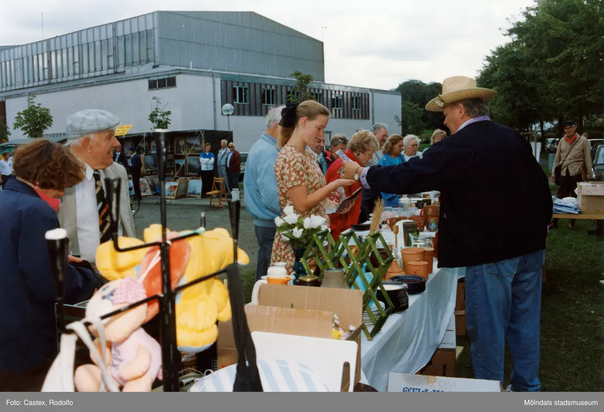 Loppmarknad på Frejaplan i Mölndal på 1990-talet. Idrottshuset/Aktiviteten i bakgrunden.