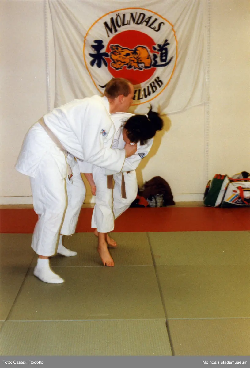 Titel: En man och en kvinna från Mölndals Judoklubb tränar judo i oktober 1996.