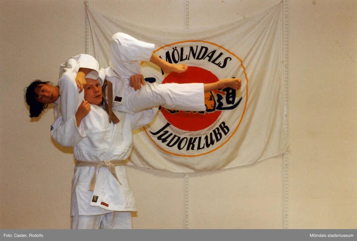 Titel: En man och en kvinna från Mölndals Judoklubb tränar judo i oktober 1996.