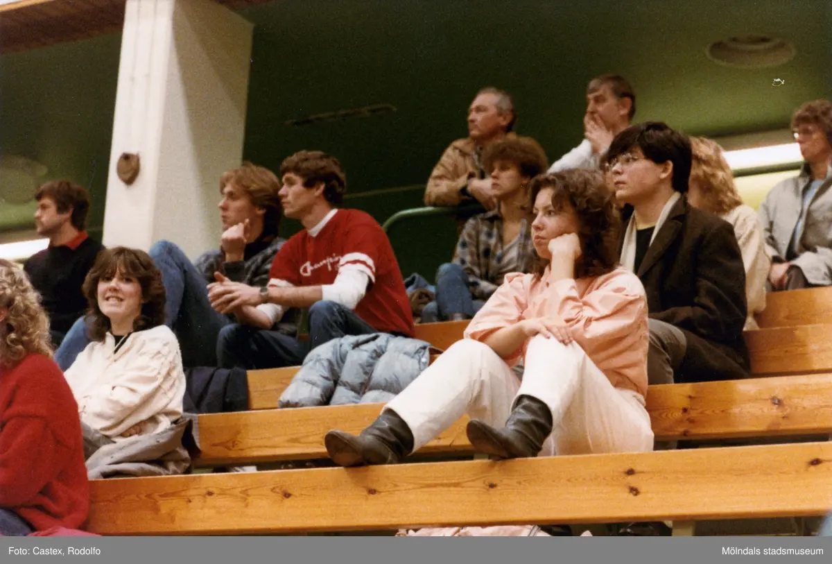 Titel: Kvarnby Basket spelar match i Mölndals idrottshus/Aktiviteten, år 1984. Motståndarlag och slutresultat är okända. Publik som följer matchen från läktaren.