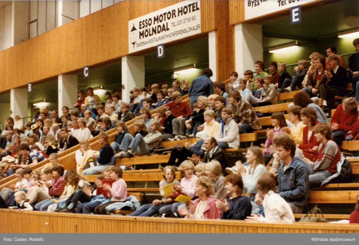 Kvarnby Basket spelar match i Mölndals idrottshus/Aktiviteten, år 1984. Motståndarlag och slutresultat är okända. Publik som följer matchen från läktaren.