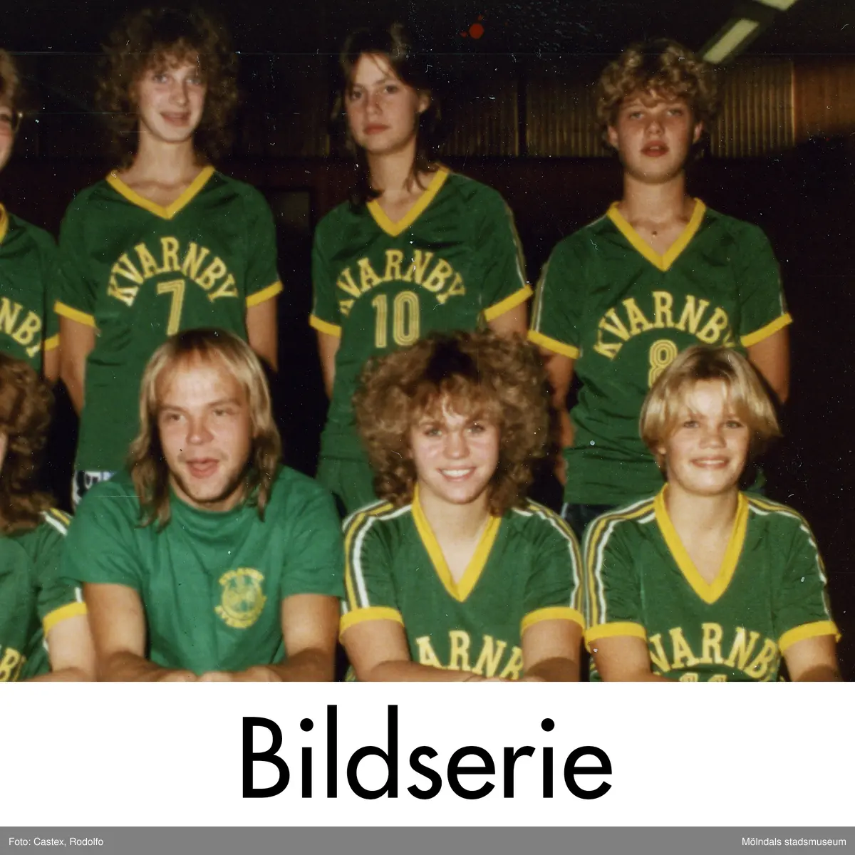 Serie om fyra fotografier som visar lagbilder av Kvarnby Basket tagna i en idrottshall i Mölndal, år 1983.