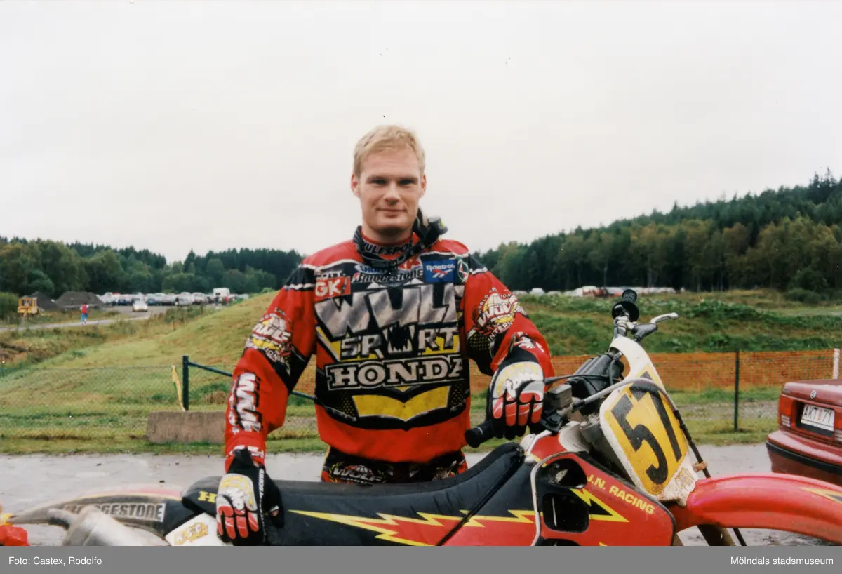 Porträtt av en motocrossförare. Fotografi taget i samband med SM i motocross på Blixåsbanan i Balltorp, Mölndal, år 1998.