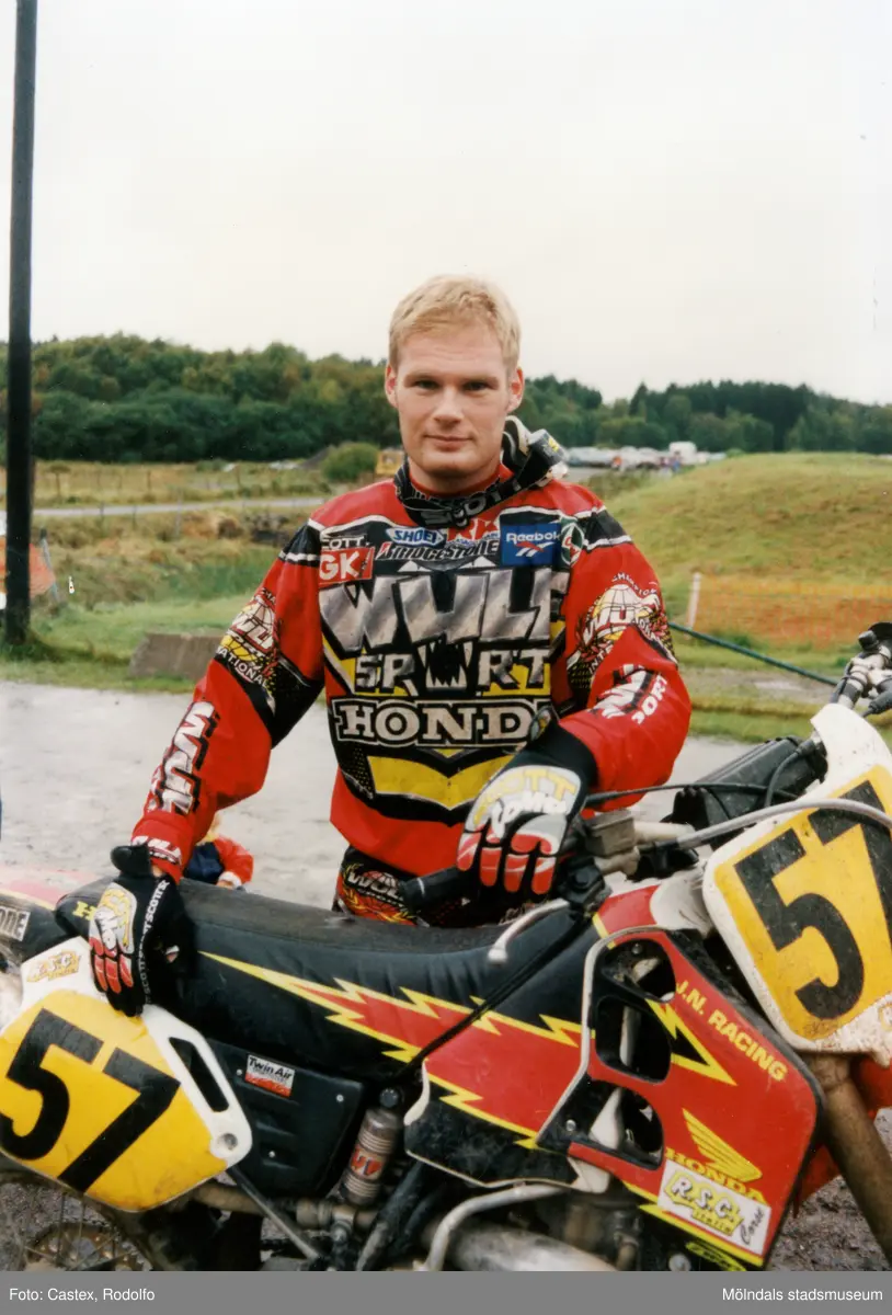 Porträtt av en motocrossförare. Fotografi taget i samband med SM i motocross på Blixåsbanan i Balltorp, Mölndal, år 1998.