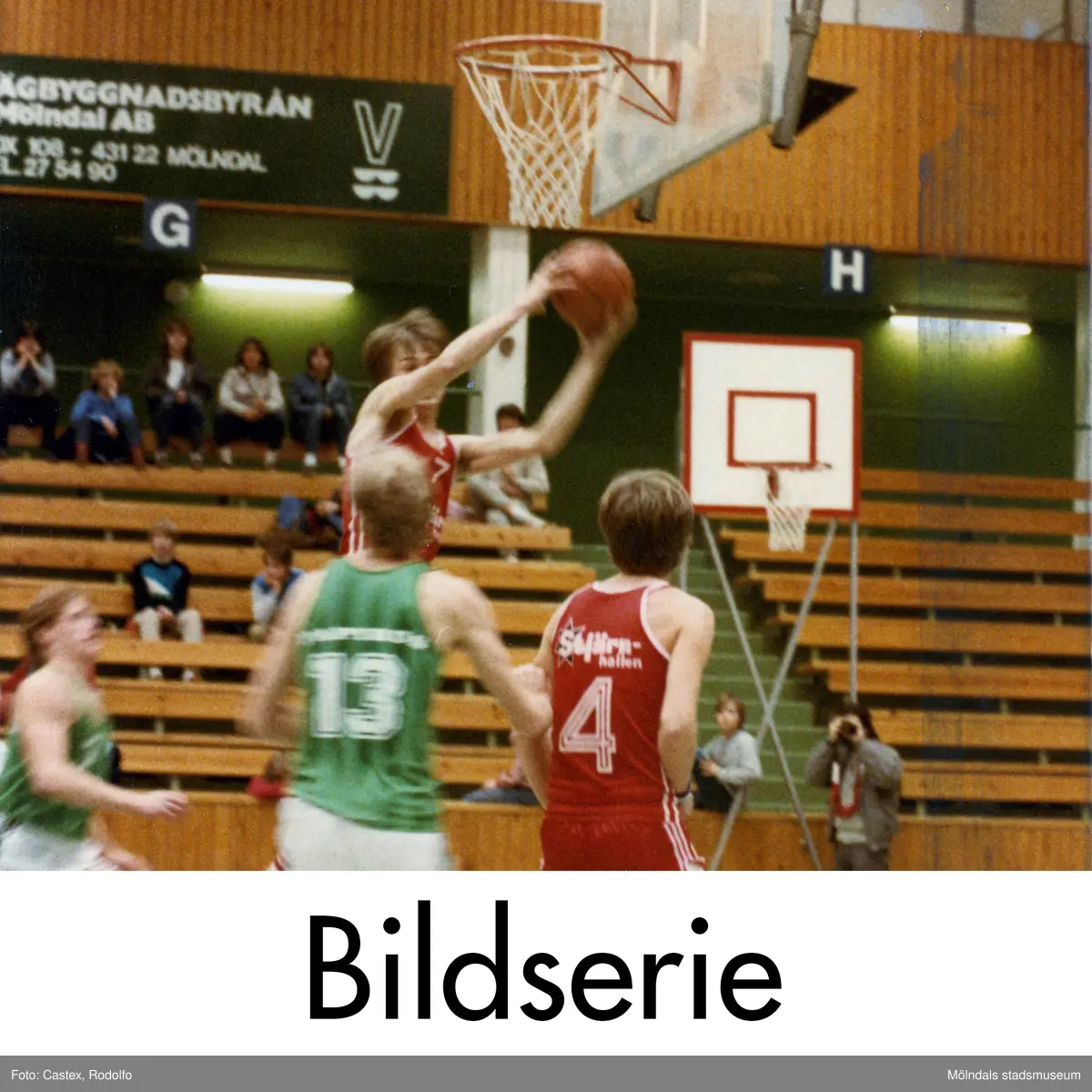 Serie om fyra fotografier som visar Kvarnby Basket spela match i Mölndals idrottshus/Aktiviteten, år 1984. Motståndarlag och slutresultat är okända.